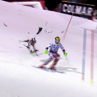 Marcel Hirscher casi es alcanzado por el aparato que cayó sobre la pista
