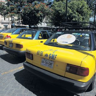 Taxistas del sitio 22 de La Minerva se encuentran sentados, esperando su turno para brindar un servicio; son al menos 11 los autos amarillos estacionados. Es miércoles.