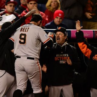 WASHINGTON, ESTADOS UNIDOS (05/OCT/2014).- Brandon Belt sacudió un jonrón frente a Tanner Roark en la entrada18, para que los Gigantes de San Francisco vencieran ayer 2-1 a los Nacionales de Washington en un juego que impuso un récord.