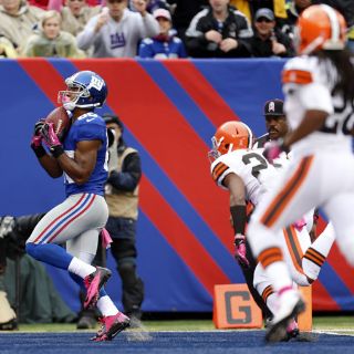 EAST RUTHERFORD, NUEVA JERSEY (07/OCT/2012).- Víctor Cruz estableció un récord personal al atrapar tres pases de touchdown para guiar a los Gigantes de Nueva York a una victoria por 41-27 el domingo sobre los Cafés de Cleveland, que siguen sin triunfos en la temporada.