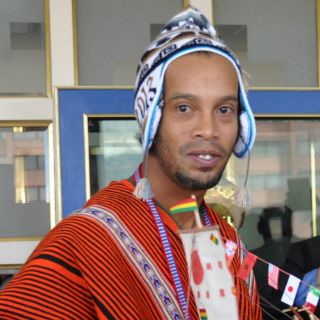 LA PAZ, BOLIVIA (12/MAR/2013).- El futbolista brasileño Ronaldo de Assis Moreira, conocido como Ronaldinho Gaúcho, fue objeto hoy de un homenaje de parte del gobernador de la región boliviana de La Paz, el oficialista César Cocarico, que le obsequió tres piezas de la indumentaria típica de los indígenas aimaras.