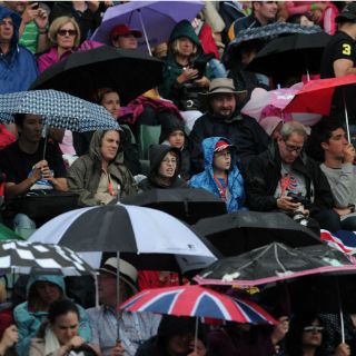 LONDRES, INGLATERRA (05/AGO/2012).- El encuentro por la medalla de bronce entre el argentino Juan Martín del Potro y el serbio Novak Djokovic, fue interrumpido a causa de la lluvia con ventaja para el balcánico por 3-2 y el servicio en poder del sudamericano.