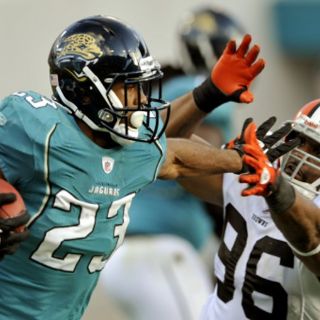 JACKSONVILLE, FLORIDA (21/NOV/2010).- Maurice Jones-Drew atrapó un pase para 75 yardas y luego anotó un touchdown de una yarda para darle el domingo a los Jaguares de Jacksonville un triunfo 24-20 sobre los Cafés de Cleveland.