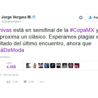 GUADALAJARA, JALISCO (20/OCT/2016).- Luego de que se diera a conocer que el Clásico Nacional tendrá una nueva historia, cuando Chivas y América se encuentren en la semifinal de la Copa MX, el dueño del rebaño, Jorge Vergara envió un irónico mensaje a través de Twitter.