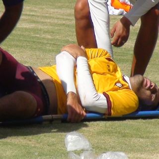 GUADALAJARA, JALISCO (02/AGO/2011).- Durante el entrenamiento de este martes, el zaguero de los Estudiantes Tecos, Juan Zazueta, sufrió un accidente con una de las ligas que utilizan para fortalecer las piernas.