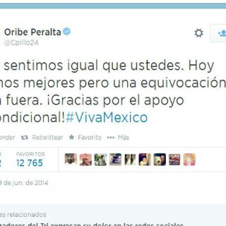 Oribe Peralta escribió en su cuenta de Twitter: @Cpillo24 "Nos sentimos igual que ustedes. Hoy fuimos mejores pero una equivocación nos deja fuera. ¡Gracias por el apoyo incondicional!#VivaMexico."