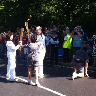 La emoción se encendió más cuando se vio que a lo lejos se acercaba el fuego olímpico de la mano de Daniel Devitt, quien fue seleccionado por una compañía telefónica. Se hace el relevo del fuego, siendo el momento clímax del recorrido por este peculiar barrio.