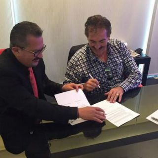 Los Jaguares subieron una foto en la que se observa a Hugo López Chargoy, presidente del equipo, en compañía del estratega, quien estampa su rúbrica en el contrato.