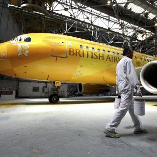 Más de 250 litros de pintura dorada, blanca y amarilla se emplearon para decorar la aeronave que traerá al Reino Unido la antorcha olímpica.