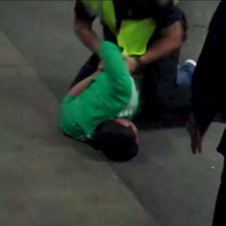 Uno de los dos policías tuerce el brazo derecha de uno de los dos aficionados y sorpresivamente azota con fuerza contra el piso de concreto el rostro del latino que no muestra resistencia. Otro aficionado de la selección mexicana, que observa la escena, reprocha al policía por su fuerza excesiva y el agente responde que el sometido 'no se detuvo'.