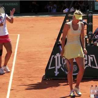 PARÍS, FRANCIA (02/JUN/2011).- Maria Sharapova cometió diez dobles faltas, la última para cerrar su derrota ante la china Na Li, que venció a la rusa por 6-4 y 7-5 y se clasificó por primera vez para disputar la final de Roland Garros.