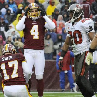 LANDOVER, MARYLAND (12/DIC/2010).- Un error en un intento de punto extra en un campo mojado cuando faltaban nueve segundos evitó que los Pieles Rojas de Washington empataran el partido del domingo contra los Bucanerosde Tampa Bay, que los vencieron por 17-16.