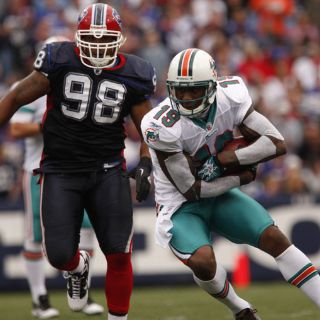 ORCHARD PARK, NUEVA YORK (12/SEP/2010).- El linebacker Karlos Dansby lideró la nueva defensa de Miami con ocho tackles y un derribo del quarterback rival, Ronnie Brown anotó con un acarreo desde una yarda y Dan Carpenter pateó dos goles de campo para que los Delfines derrotasen el domingo 15-10 a los Bills de Buffalo.