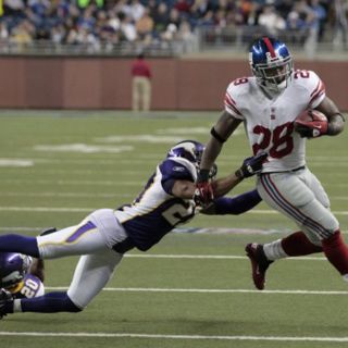 DETROIT, MICHIGAN (14/DIC/2010).- Los Gigantes de Nueva York aprovecharon la ausencia por lesión de Brett Favre y con un par de carreras largas de Brandon Jacobs y Ahmad Bradshaw vencieron el lunes por la noche por 21-3 a los Vikingos de Minnesota.