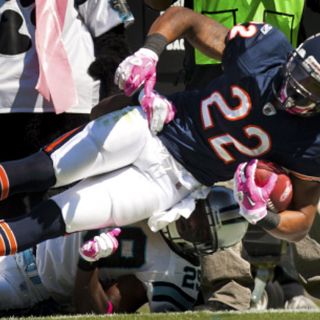 CHARLOTTE, CAROLINA DEL NORTE (10/OCT/2010).- El corredor Matt Forte anotó dos veces en el primer episodio y dirigió el ataque mientras que el defensivo Julius Peppers superó a su ex equipo al llevar a los Osos de Chicago a un triunfo por 23-6 sobre las Panteras de Carolina.