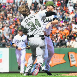 Strickland golpeó a Harper en la cadera con un lanzamiento en el octavo inning. De inmediato, el toletero de Washington corrió hacia la loma, aventándole el casco a Strickland antes de intercambiar puñetazos durante el triunfo de los Nacionales por 3-0 sobre los Gigantes.