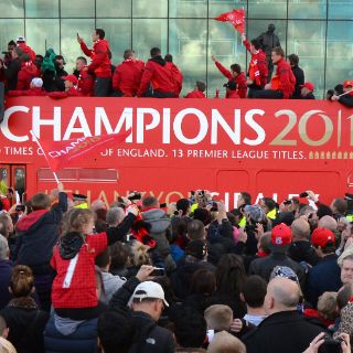 Pese a que los "diablos rojos" ganaron matemáticamente la Premier League el pasado 22 de abril, no fue hasta hoy cuando futbolistas y cuerpo técnico se subieron a lo alto de un autobús color rojo para compartir la alegría con sus seguidores.