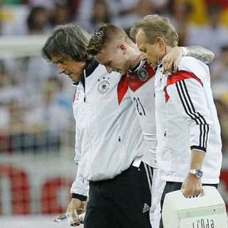 El punto oscuro en medio de la fiesta germana se dio en el último minuto del primer tiempo, cuando el atacante Reus intentó robar una pelota y terminó lesionado en su tobillo izquierdo, abandonando el campo sin siquiera poder apoyar la pierna lastimada, tras un choque desafortunado con un rival.
