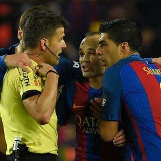 MADRID, ESPAÑA (07/FEB/2017).- Luis Suárez, delantero del Barcelona, dijo este martes después de ser expulsado ante el Atlético de Madrid que se ríe de la expulsión que vio durante el encuentro de vuelta de la Copa del Rey y afirmó que espera que su club apele la decisión arbitral para poder jugar la final.