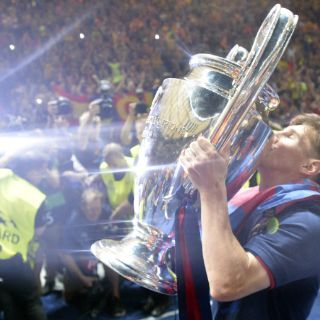 MADRID, ESPAÑA (08/JUN/2015).- El argentino Leo Messi, que acaba de lograr con el Barcelona la "tripleta" (liga y Copa española, y Liga de Campeones de Europa), dobla al portugués madridista