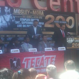 Mosley y Mora, de origen mexicano, se dieron cita puntual en el escenario que se montó en el exterior de Staples para acompañar a De la Hoya en la rueda de prensa.