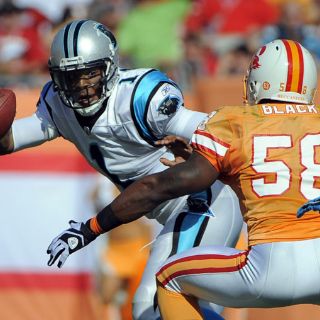 TAMPA, FLORIDA (04/DIC/2011).- Cam Newton corrió el domingo para tres anotaciones con las que impuso la marca de acarreos de touchdown de un quarterback de la NFL en una temporada y encabezó a las Panteras de Carolina a la paliza de 38-19 que le propinaron a los Bucaneros de Tampa Bay.
