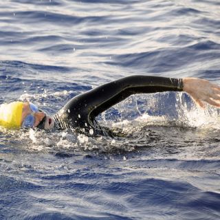 Nyad, que a través de un tubo ingiere líquidos y se alimenta con mantequilla de maní por su alto valor calorífico, canta mentalmente para hacer más llevadero el esfuerzo.