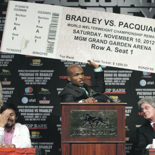 “Sacudiré al mundo deportivo al vencer a Pacquiao y le concederé la revancha el 10 de noviembre en la Arena Garden”, comentó el Bradley, mientras agitaba un gigantesco boleto falso, en donde se “anunciaba” la revancha entre ambos con la presunta fecha.