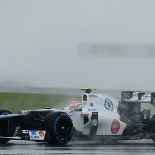 SILVERSTONE, INGLATERRA (06/JUL/2012).- El piloto mexicano de Sauber, Sergio Pérez, marcó el cuarto mejor tiempo del primer entrenamiento libre para el Gran Premio de Gran Bretaña de Fórmula Uno, en la que el francés Romain Grosjean (Lotus) logró el mejor tiempo, en una sesión que estuvo marcada por la fuerte lluvia en el circuito de Silverstone y en el que no marcó tiempo el español Fernando Alonso (Ferrari), líder del mundial.