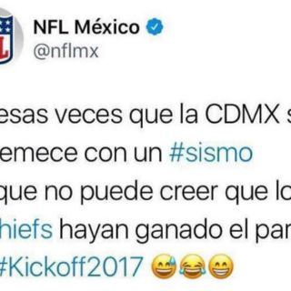''De esas veces que la CDMX se estremece con un #sismo porque no puede creer que los @Chiefs hayan ganado el partido de #Kickoff2017'', dijo la cuenta oficial de la liga en el país azteca.