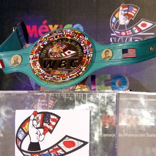 José Sulaimán, presidente del CMB presenta el cinturón que se disputará durante la pelea del próximo 14 de septiembre entre Saúl Álvarez y Floyd Mayweather Jr