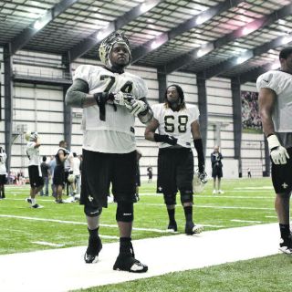GUADALAJARA, JALISCO (28/JUL/2012).- Un intenso saludo del suspendido entrenador en jefe Sean Payton esperaba a los jugadores de los Santos cuando entraban a un campo bajo techo para su práctica del día.