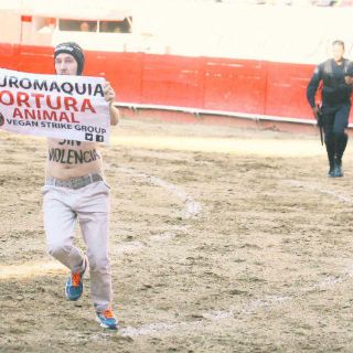 GUADALAJARA, JALISCO (27/FEB/2017).- El festejo de la última corrida de aniversario en la Plaza de Toros Nuevo Progreso estaba en su apogeo. Pablo Hermoso de Mendoza recién había terminado con su enemigo “Tortolito”, la afición a la tauromaquia aplaudía, cuando de pronto apareció de los tendidos del coso de la Colonia Monumental una persona dispuesta a darse a notar. Traía el torso desnudo, en lugar de ropa, hacía alusión a la no violencia animal. Pero eso no fue todo, consigo portaba una pancarta con un letrero con la leyenda “Tauromaquia, tortura animal”. Más tardó en caer al ruedo que la seguridad pública en capturarlo y llevarlo a la puerta de picadores, en donde fue invitado a abandonar el coso tapatío.