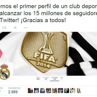 "¡Somos el primer perfil de un club deportivo en alcanzar los 15 millones de seguidores en Twitter! ¡Gracias a todos!", informó desde su cuenta @realmadrid.