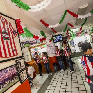 Triunfos, momentos especiales, jugadores en acción. Todo ello plasmado en fotografías que ocupan las paredes de este negocio, que indica en una de sus entradas que se está ingresando a territorio chiva. Inclusive otro llamativo detalle salta a la vista: todos los empleados de este lugar visten la playera rojiblanca cada vez que el chiverío tiene un partido.