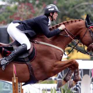 GUADALAJARA, JALISCO (11/AGO/2011).- El jinete del Club Ecuestre La Escondida, Saúl Moreno montando “Chepepe La Escondida”, se colocó en la punta del selectivo para formar el equipo mexicano que participará en los Juegos Panamericanos, que inició este jueves en el Guadalajara Country Club.