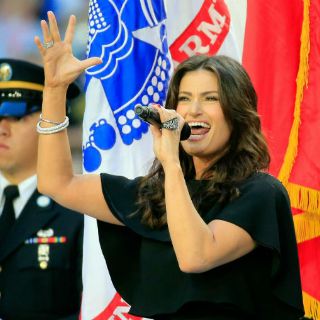 GLENDALE, ARIZONA (01/FEB/2015).- Idina Menzel interpreta el himno de los Estados Unidos previo al arranque del partido del Super Bowl; mientras John Legend está interpreta "America the beautiful".