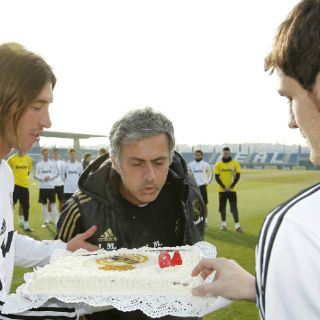 En nombre de toda la plantilla, Iker y Ramos obsequiaron a Mourinho con una tarta donde aparecía el escudo del club y la frase 'Felicidades míster'.
