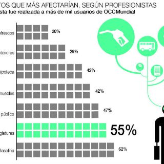 Seis de cada 10 profesionales piensan que las alzas mensuales a la gasolina, consideradas en la reforma, son el rubro que más afectaría su presupuesto por el monto que destinan mensualmente y el impacto que éstas tendrían en la inflación. Es relevante señalar que, de acuerdo a la encuesta, el gasto promedio semanal en gasolina para cuatro de cada 10 profesionistas es de 250 a 500 pesos; sin embargo, dos de cada 10 gasta entre 500 y 750 pesos y uno de cada 10 más de 750 a la semana.