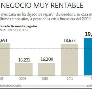 La repartición de dividendos en el 2012 representó 68.9% de las utilidades netas alcanzadas en el mismo lapso, lo que es congruente con su política de dividendos, donde los últimos cinco años ha promediado un reparto de dividendos de 50% de las utilidades totales.