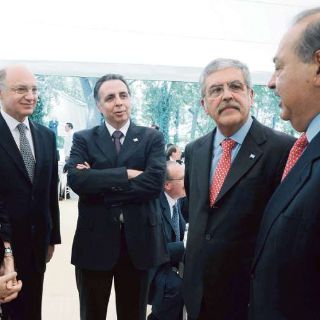 El funcionario añadió que Slim viajará a Argentina en mayo próximo para precisar los detalles de estas inversiones, aunque también manifestó su interés en invertir en el sector energético y en la minería, pero ahí no hay nada nuevo. En la imagen aparecen la embajadora argentina, Patricia Vaca (izquerda); el ministro de Relaciones Exteriores de Argentina, Héctor Timerman (segundo desde la izquierda); su par mexicano de Economía, Bruno Ferrari (centro), y el magnate mexicano Carlos Slim (derecha).