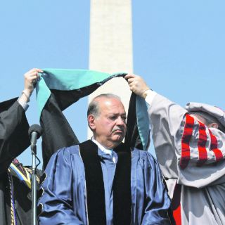 Con el emblemático obelisco de fondo, Slim recibió el grado durante una ceremonia de graduación al aire libre en la explanada conocida como el “Mall” de Washington.