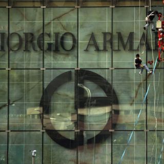 BEIJING, CHINA (27/JUN/2011) .-Varios trabajadores limpian el frente de un centro comercial que muestra el logotipo de la marca de moda italiana Giorgio Armani, en el centro de Beijing, China.