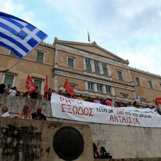 Los manifestantes recibieron la visita de diferentes personalidades del partido Syriza, en el poder, en una plaza en la que se vieron pancartas como "Si no los detenemos ellos no se detendrán jamás" o "No al euro", o "No se puede sobornar al pueblo, el país no está en venta".