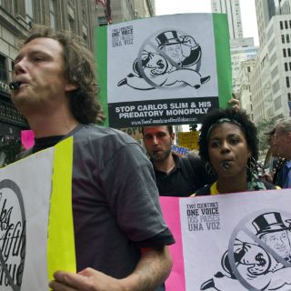 NUEVA YORK, ESTADOS UNIDOS (07/AGO/2012).- Un grupo de manifestantes protestó hoy en Nueva York en contra del magnate mexicano Carlos Slim, a quien acusan de monopolio a través de sus empresas de telecomunicaciones.