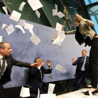 La joven, de unos 20 años, que se había introducido entre los periodistas presentes, trepó a una mesa frente a Draghi gritando en inglés "¡Alto a la dictadura del BCE!", mientras lanzaba confettis.