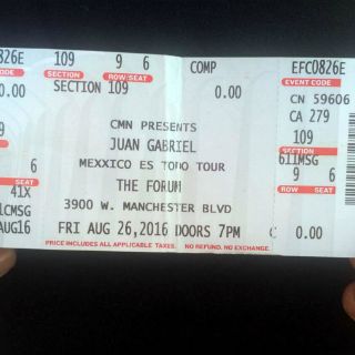 CIUDAD DE MÉXICO (28/AGO/2016).- Algunos de los admiradores del cantautor Juan Gabriel que tuvieron la oportunidad de disfrutar el pasado viernes del último concierto de "El Divo de Juárez" en Los Ángeles, California , han comenzado a subir a sus redes sociales el boleto que da testimonio del acontecimiento.