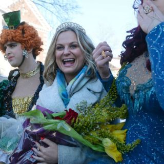 Los estudiantes y admiradores llegaron a Massachusetts Avenue para el desfile con letreros que decían "Leslie Knope para presidente" y gritando "Te amamos Amy!" mientras pasaba en el asiento trasero de un Bentley convertible.