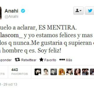 ''ES MENTIRA. @velascom_ y yo estamos felices y más unidos que nunca. Me gustaría que supieran el gran hombre que es. Soy feliz.'' escribió la cantante pocos minutos después de darse a conocer la nota publicada por una revista de espectáculos.