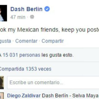 CIUDAD DE MÉXICO (09/JUL/2015).- A través de su cuenta de Facebook, el DJ Dash Berlin informó que está bien, luego de haberse informado que desapareció en una excursión dentro de la selva maya.